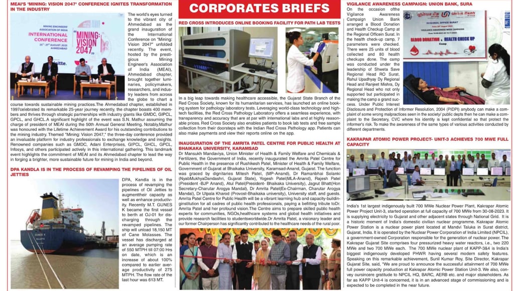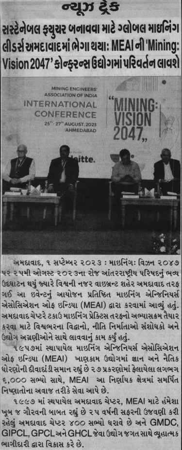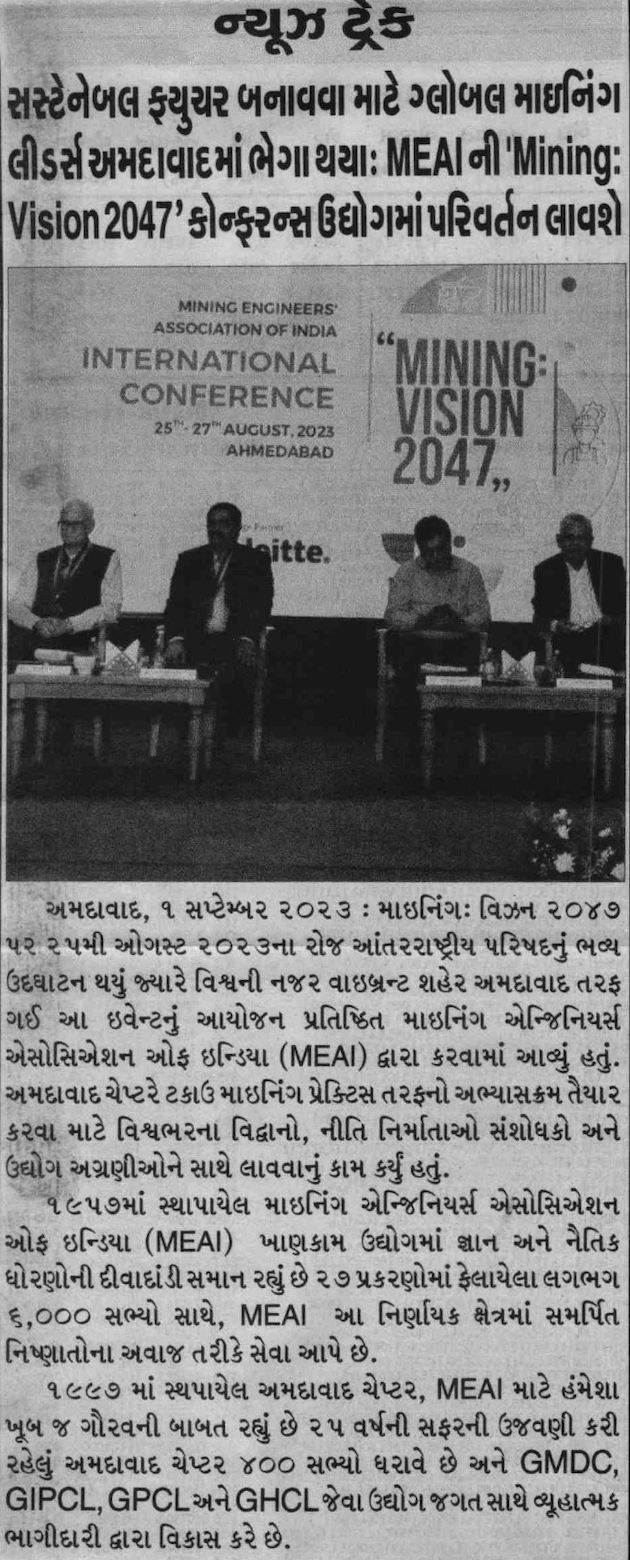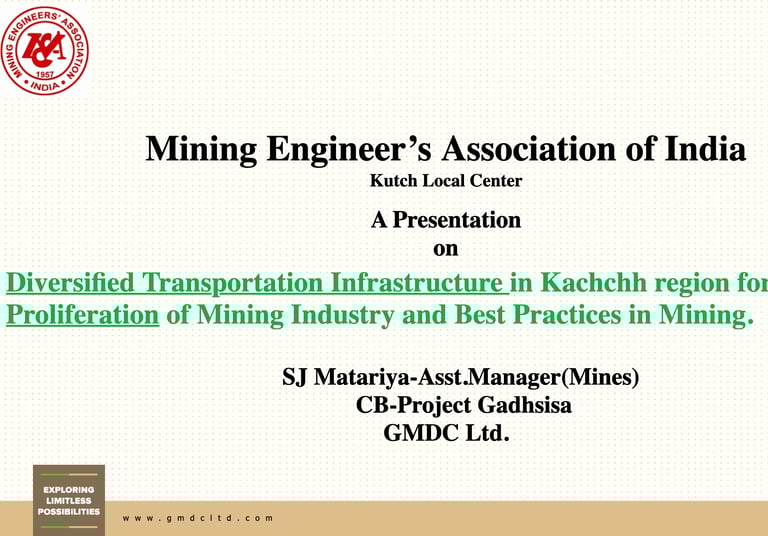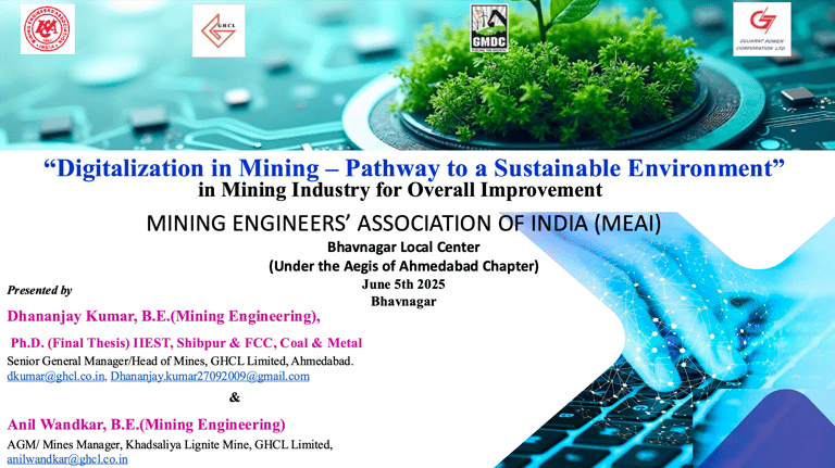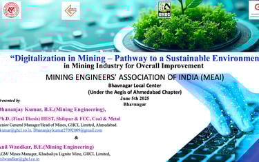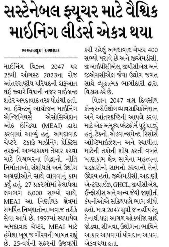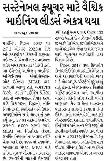 Half day seminar with mine visit was organised by the Bhavnagar local centre of mining Engineers Association of India, Ahmedabad chapter on “ value addition of minerals available at lignite mines in Bhavnagar'' on 23rd October 2021, in joint collaboration with Gujarat heavy Chemicals Limited, Gujarat mineral Development Corporation Limited and Gujarat Power Corporation Limited at VTC, Khadsaliya lignite mine, Bhavnagar. Three technical papers presented on beneficiation of pyrite and bentonite Minerals which are available in consortium with lignite. The speakers showcased various beneficiation methodologies for technical session, And introductory program was arranged for newly joint mining engineers of GPCL & new MEAI members. the best mining practices and progressive closer activities undertaken by GHCL were showcased to participants, followed by a visit to GHCL Khadsaliya Lignite Mine. (Photos from brochure).