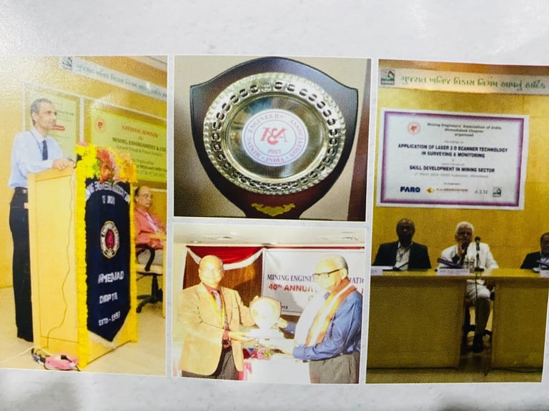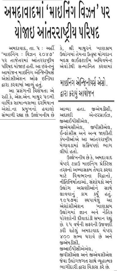 The chapter organised its first Independence National seminar on “ Mining Environment and CSR: Current trends and future scenario” in July 2012. The chapter has been awarded with “Best Chapter of the Year award” twice by M E A I, in the years 2011-12 and 2014-15, with a few members being awarded with the Prestigious MEAI National Awards in the past years. Chapter launched Students Chapters at GEC, Gandhinagar( 2012), GEC, Palanpur( 2013) and M.G. Science College , Ahmedabad( 2013). Seminars were also organised at these Students Chapters regularly. The chapter celebrated the first Indian mining day on 1st November 2013 and was awarded “ the MEAI’s Best IMD celebration award”. Later, The chapter received this award for the next 5 years consecutively. Subsequently, it shared this award with other chapters. The chapter started celebrating its Foundation Day from 2014, declaring a posthumous Special award to the late Shri. B. K. Antia, The Founder Chairman of the chapter. The award was received by Smt. Antia.